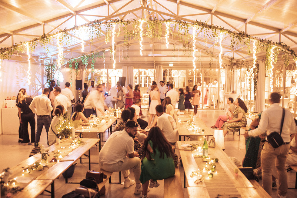 Le henné à paillettes et la déco colorée et épurée. Les grandes tablées sans plan de table. Tout était fait pour que leurs invités se rencontrent, et profitent du mariage sans code ni prise de tête.